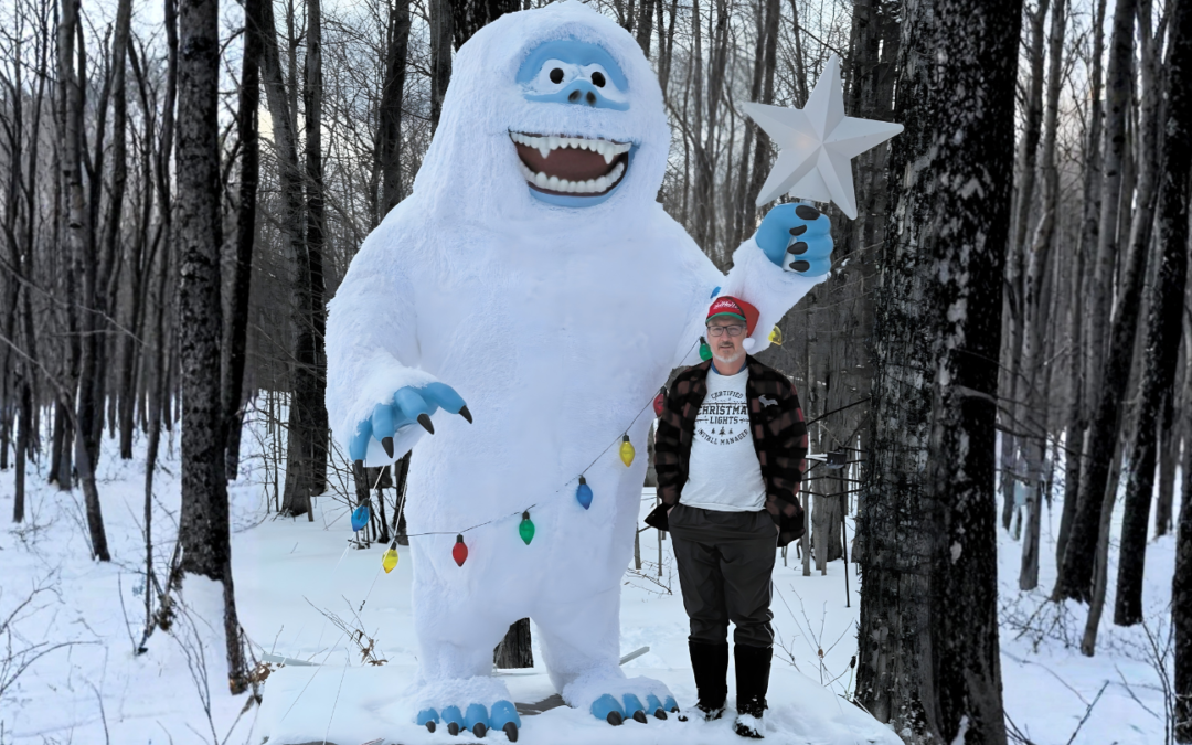 Family members pitch in when needed. In addition to Noah’s help on the ladder, son-in-law Michael Graves assisted with moving a large Abominable Snowman decoration — known as a “Bumble” — from Ackerman’s workshop to a custom-built platform.