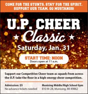 Munising competes this Thursday, Jan. 29, at Norway. The Mustangs then host a competition at noon on Saturday, Jan. 31, in their home gym. Admission is $5 at the door.